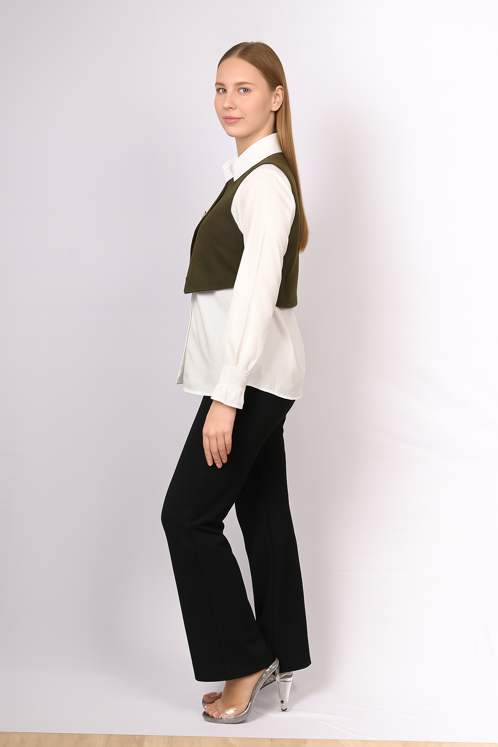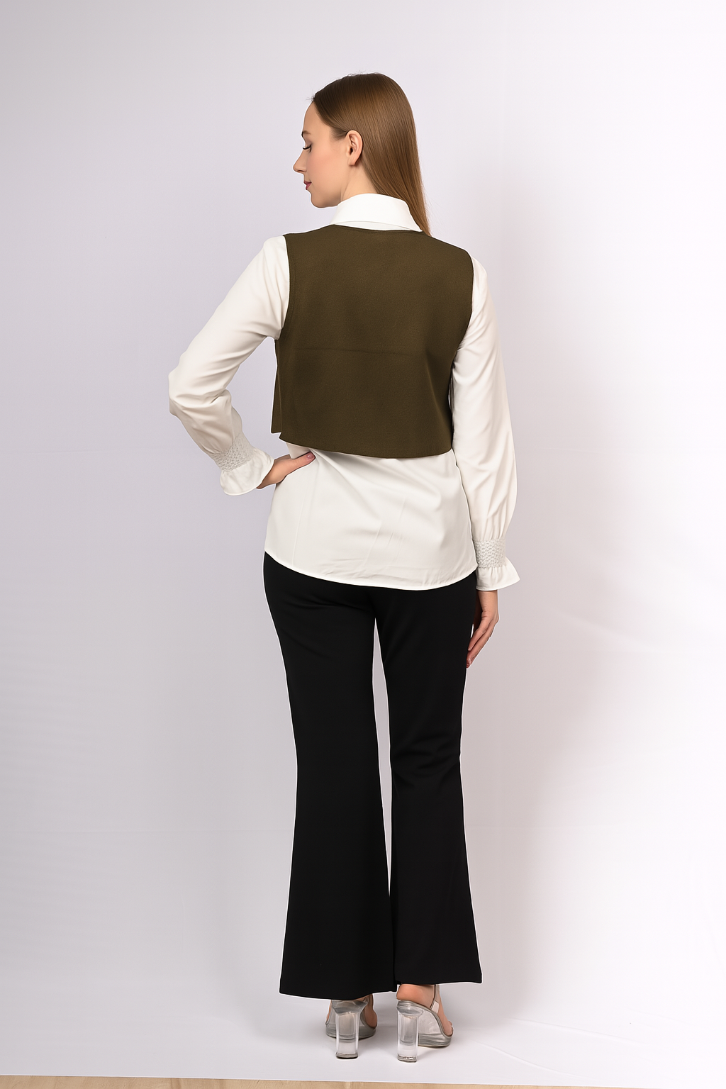 Step into effortless elegance with this two-piece layered set featuring a crisp white shirt paired with a stylish cropped jacket. The full-sleeved shirt, designed with classic button-down detailing and ruched cuffs, serves as the perfect base for the structured overlay. The sleeveless jacket is adorned with double-breasted buttons and a curved hem, lending a contemporary twist to your everyday formal or semi-casual outfits. Together, this duo creates a smart, polished look that balances sophistication with trend.